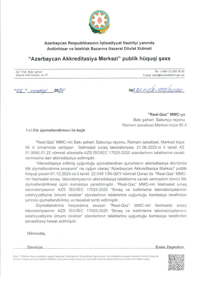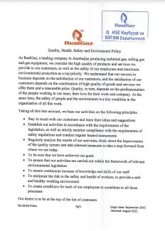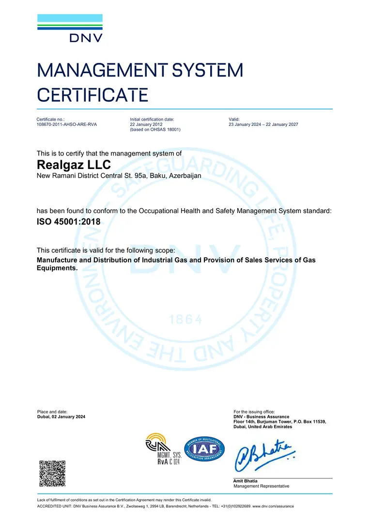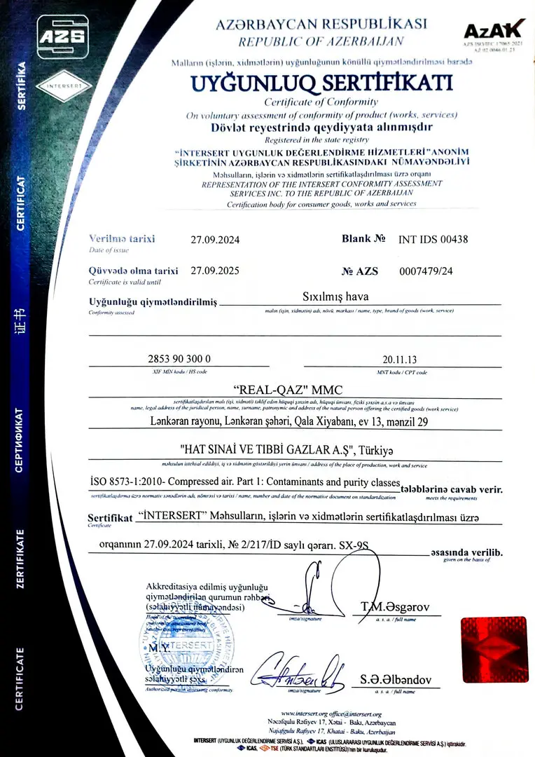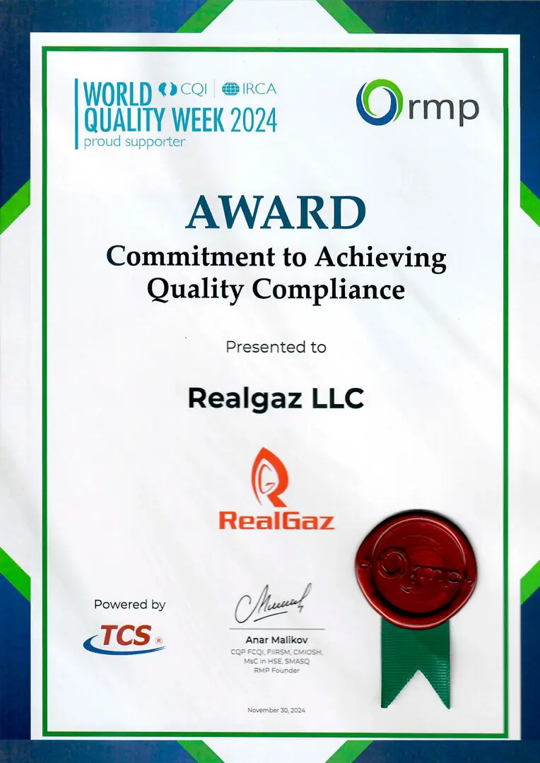 Real-Qaz Azərbaycan Respublikasında texniki qazlar sahəsində ISO 9001:2000 sertifikatını alan ilk şirkət olmuşdur. Bu sertifikat 7 dekabr 2005-ci ildə, həmçinin OHSAS 18001:2007 sertifikatı ilə birlikdə verilmişdir. Bu qabaqcıl keyfiyyət öhdəliyi şirkətimizin regionda keyfiyyət lideri kimi nüfuzunu möhkəmləndirmişdir.Bu öncül öhdəlik sayəsində bölgədə həqiqi keyfiyyət lideri kimi nüfuz qazanmışıq.