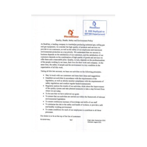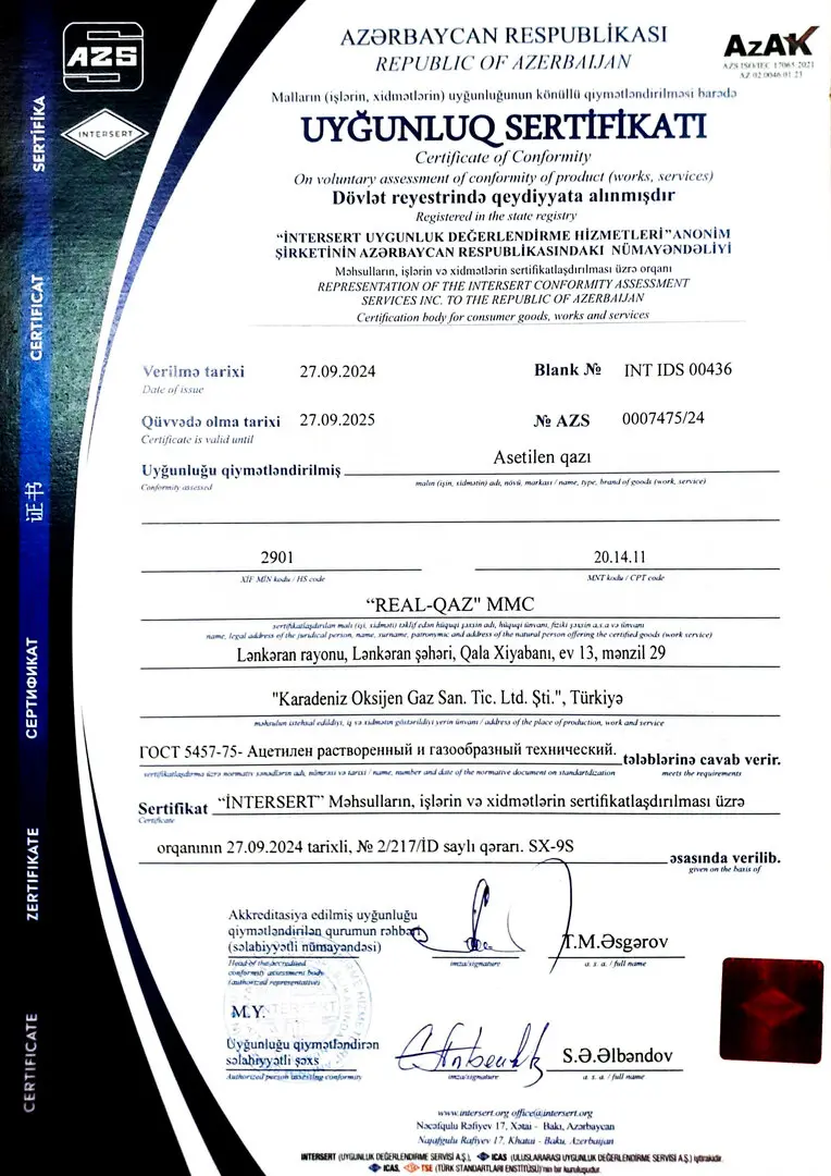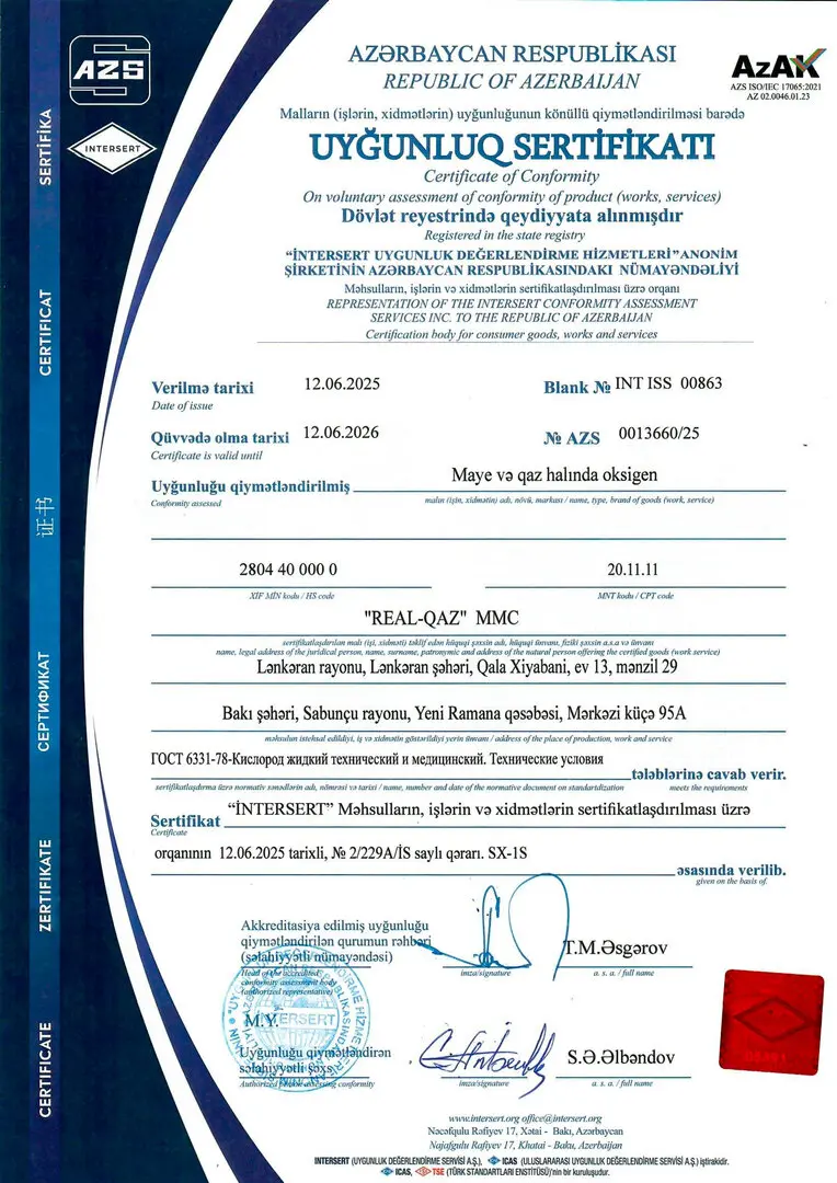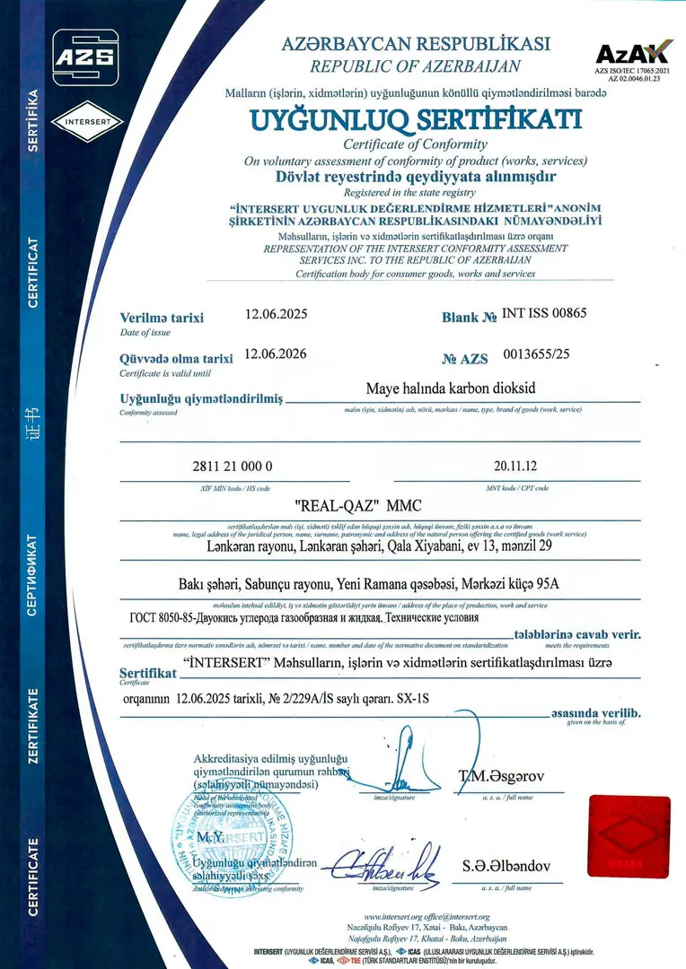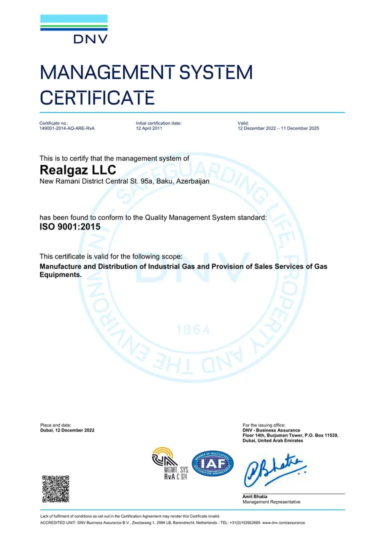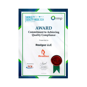 Real-Qaz Azərbaycan Respublikasında texniki qazlar sahəsində ISO 9001:2000 sertifikatını alan ilk şirkət olmuşdur. Bu sertifikat 7 dekabr 2005-ci ildə, həmçinin OHSAS 18001:2007 sertifikatı ilə birlikdə verilmişdir. Bu qabaqcıl keyfiyyət öhdəliyi şirkətimizin regionda keyfiyyət lideri kimi nüfuzunu möhkəmləndirmişdir.Bu öncül öhdəlik sayəsində bölgədə həqiqi keyfiyyət lideri kimi nüfuz qazanmışıq.