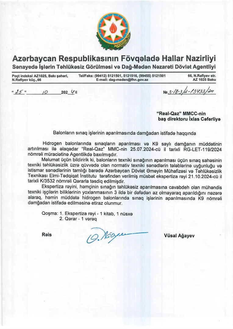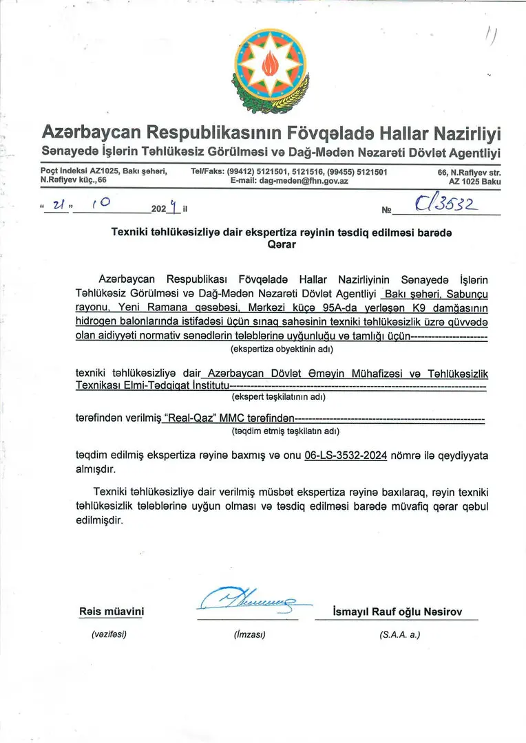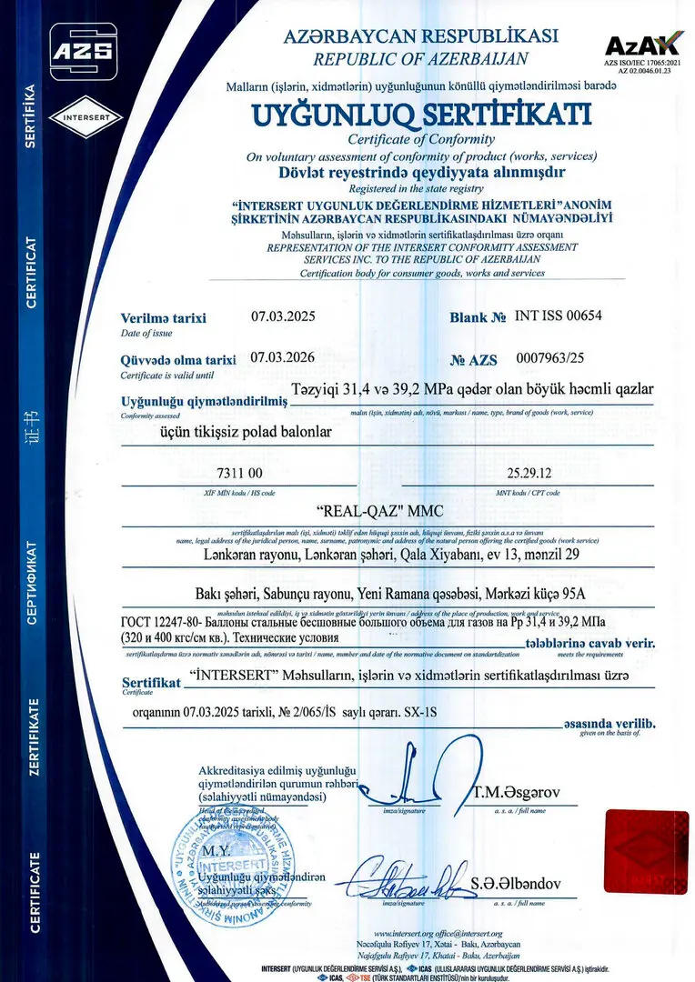 Real-Qaz, Azərbaycan Fövqəladə Hallar Nazirliyindən bütün növ balonların hidrostatik sınaqlarını həyata keçirmək üçün rəsmi icazəyə malikdir. Bu, bizə avadanlıqların təhlükəsizliyini sertifikatlaşdırmaq və rəsmi sənədlər təqdim etmək imkanı verir — bu da bizi regional bazarda fərqləndirir.