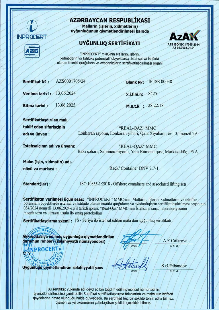 - DNV sertifikatlı qaz rackları: İstənilən sayda, manifoldlu və ya manifoldsuz, DNV GL 2.7-1 standartlarına uyğun rack-ların istehsalı